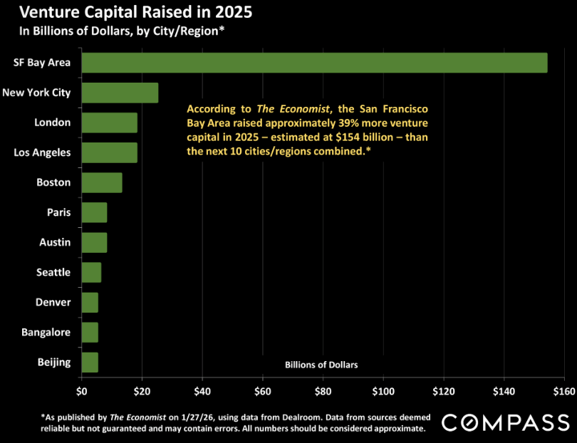 The Bay Area’s housing market remains deeply connected to the regional tech economy. In 2025, the San Francisco Bay Area led the world in venture capital investment, securing an estimated $154 billion. According to The Economist, this represents roughly 39% more capital than the next ten global regions combined. This massive liquidity, coupled with the ongoing "AI Boom," provides a stable foundation for the local real estate market, even when national consumer confidence fluctuates.