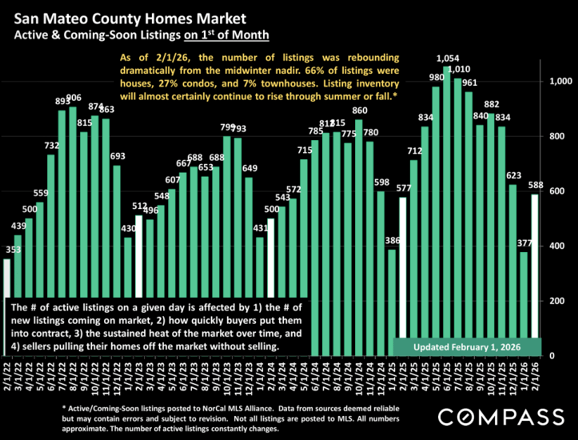 New listings in San Mateo County have rebounded significantly since the December 2025 low. It is important to note that January sales statistics often reflect contracts negotiated during the slower holiday period; therefore, the current upward trend in listings is a more accurate indicator of the active spring season ahead.