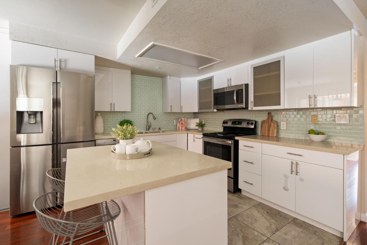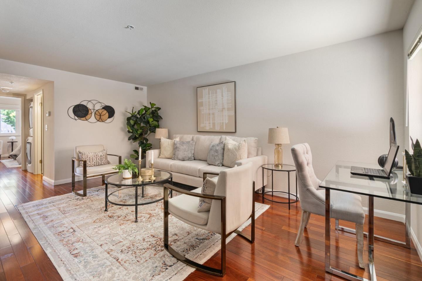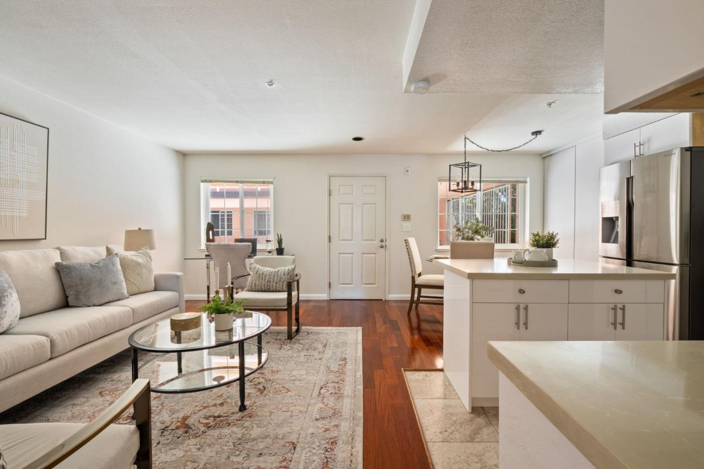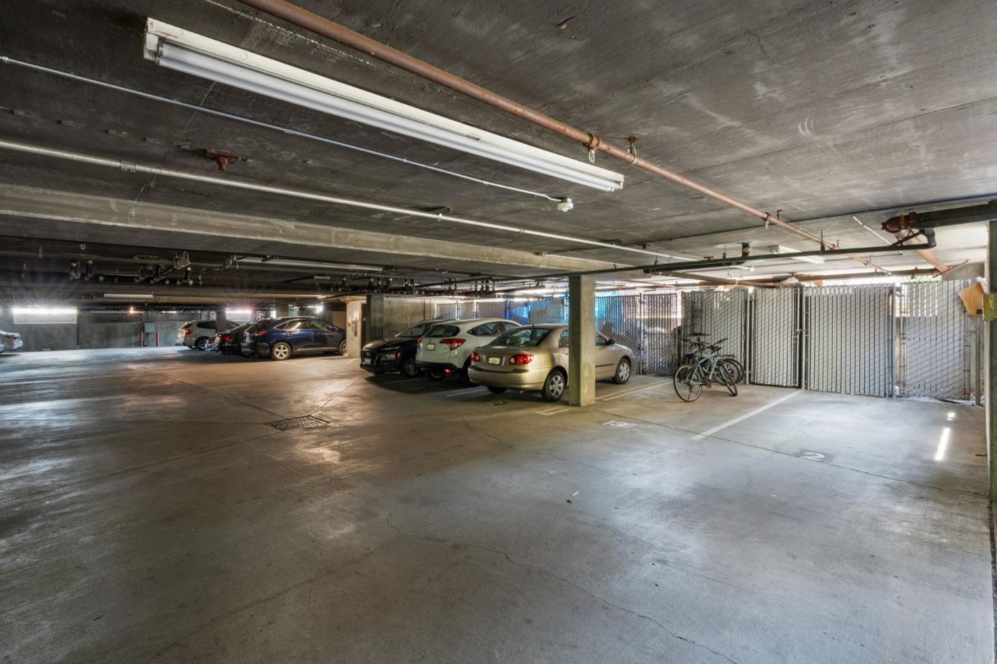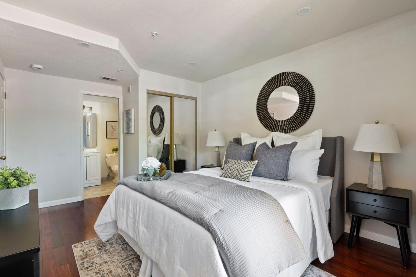 Phenomenal opportunity and it's all here- Updated one-level living with elevator access to the secure underground parking with bonus storage. Inside you'll enjoy an open-concept floorplan with elegant contemporary finishes including quartz countertops, glass tile backsplash and stainless steel appliances. Rich wood floors highlight the main living spaces, in-unit washer/dryer makes laundry a snap. Convenient breakfast bar at the island, plus additional storage in the bright dining area. Two updated baths including one en-suite. The primary bedroom opens to a private patio. Back windows are double windows for sound insulation. Building amenities include secure access, pool and spa, dedicated bike storage, plus just moments from Rengstorff Park, San Antonio Shopping Center, bike trail to Google Campus, Downtown Mountain View and all this central Silicon Valley location has to offer. You'll enjoy easy commute connections and endless shopping and dining options nearby.