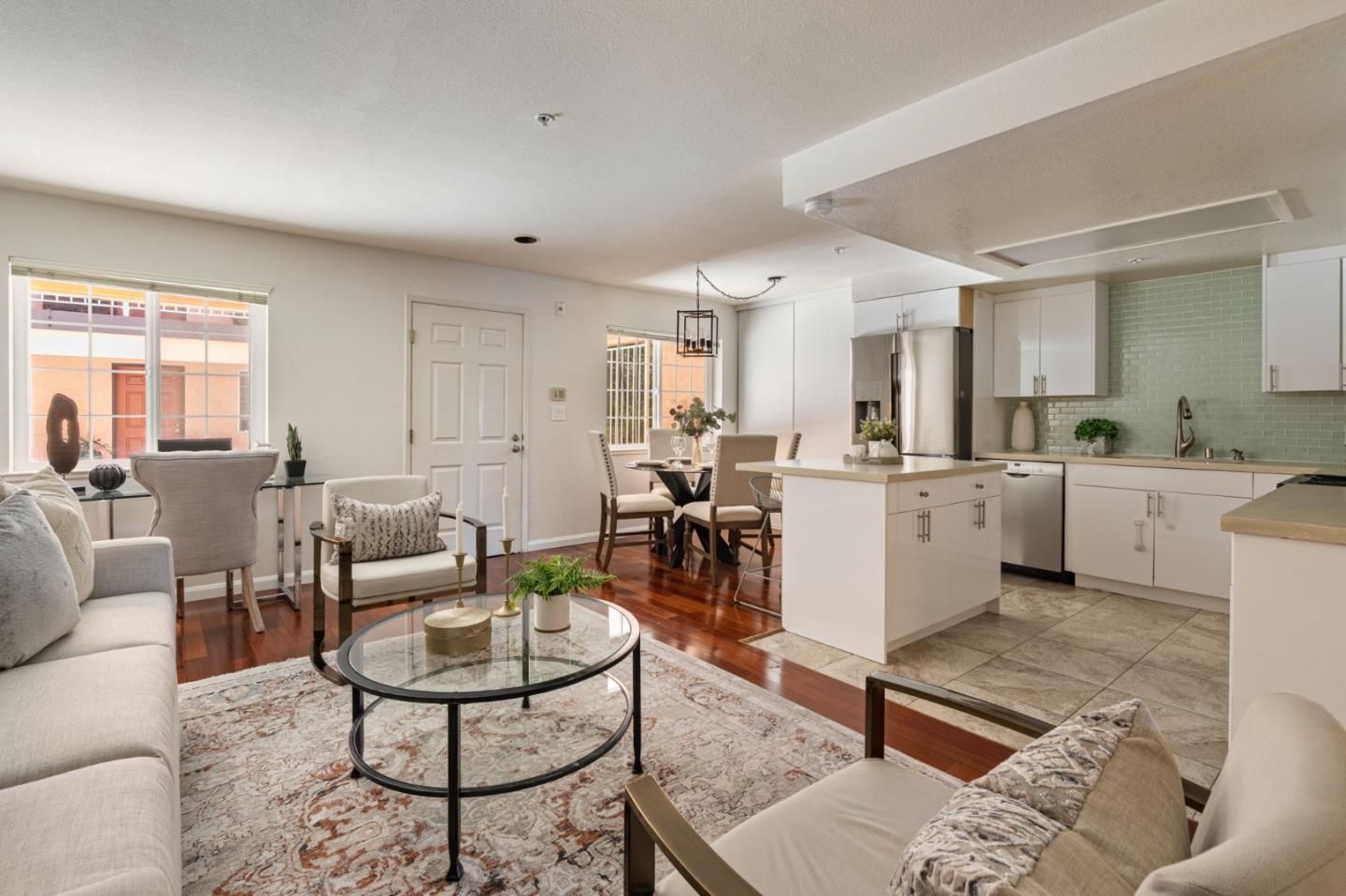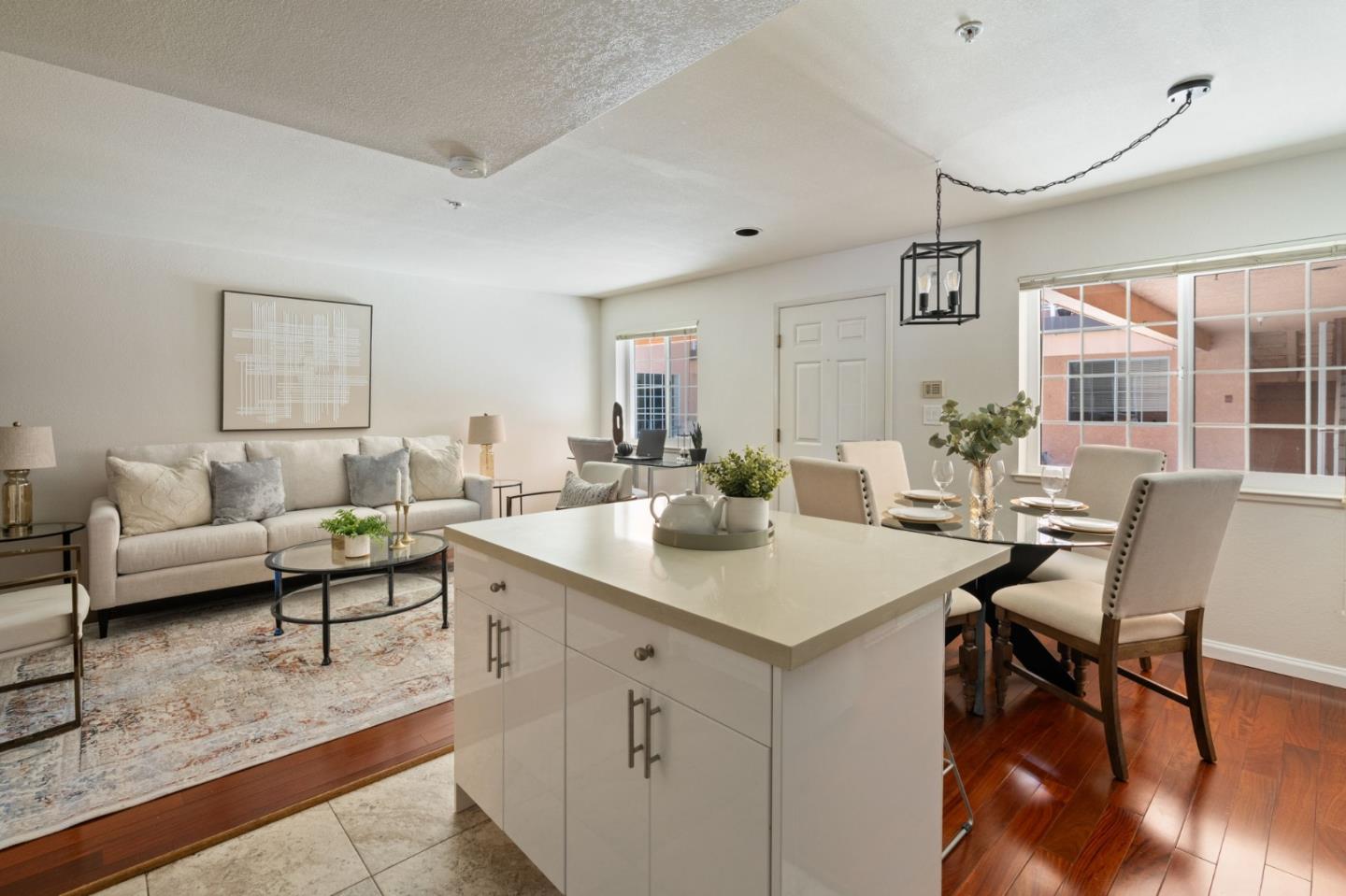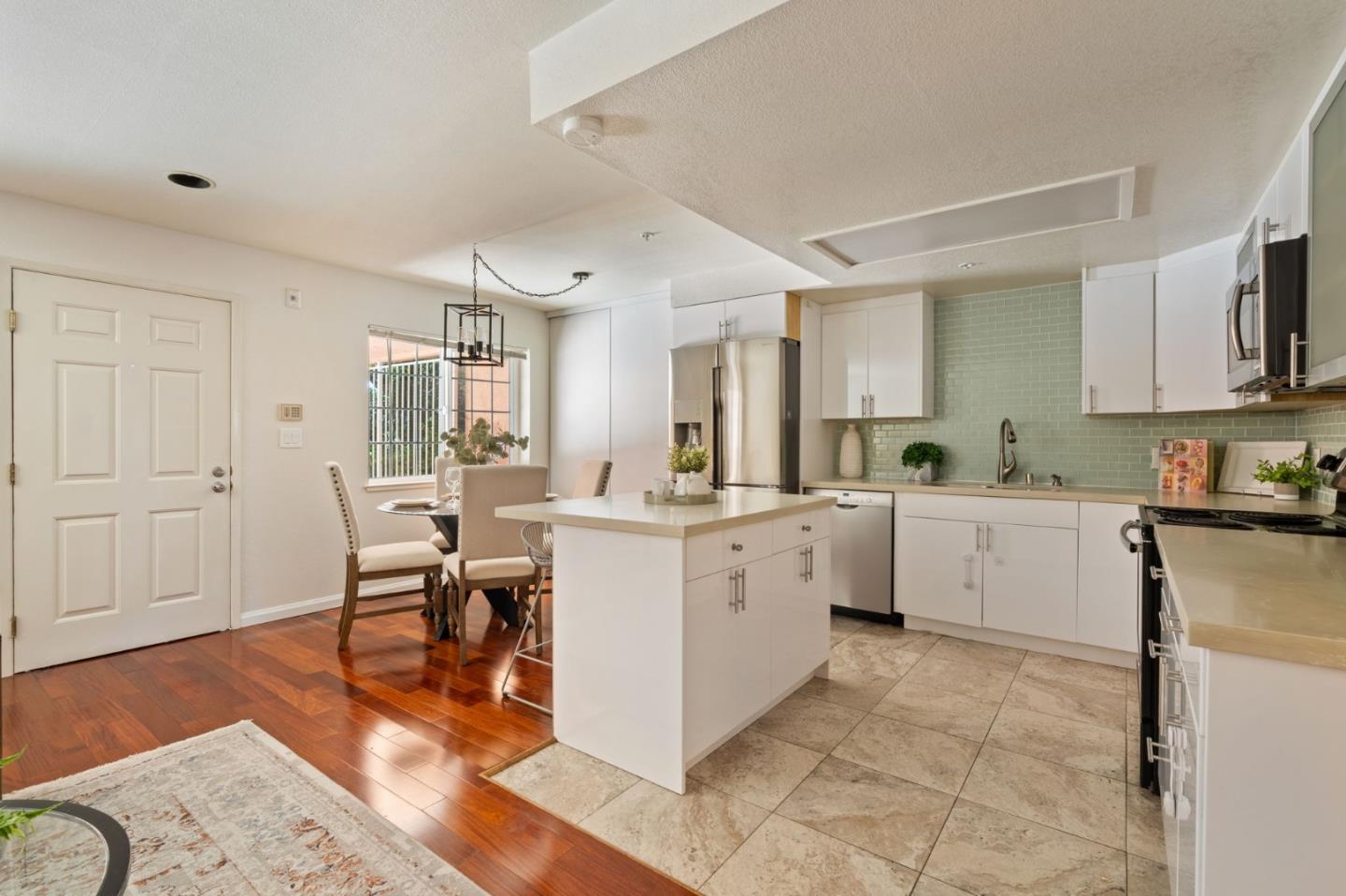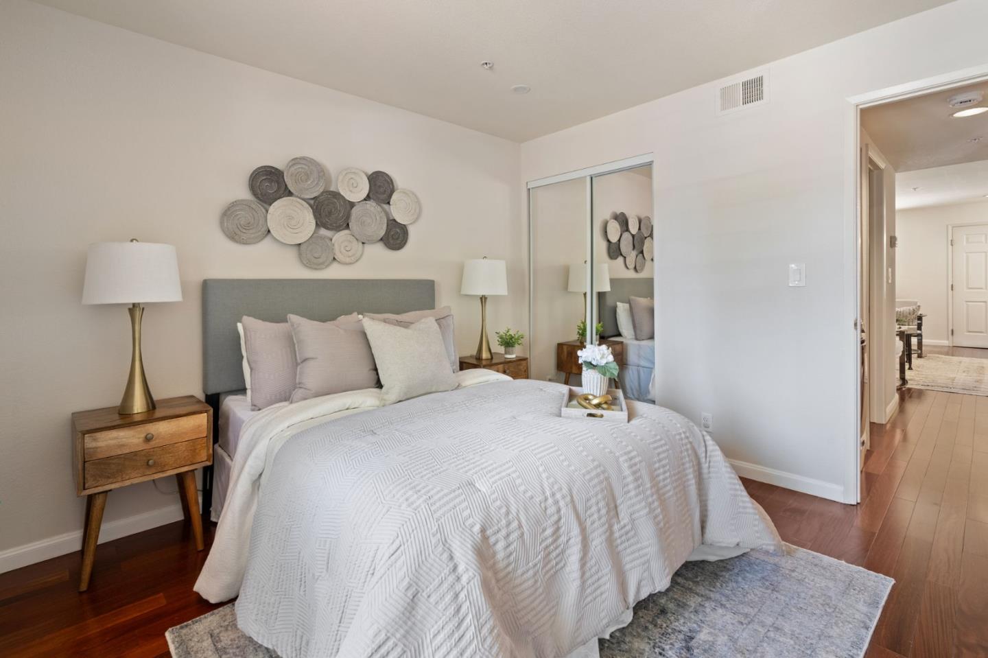 Phenomenal opportunity and it's all here- Updated one-level living with elevator access to the secure underground parking with bonus storage. Inside you'll enjoy an open-concept floorplan with elegant contemporary finishes including quartz countertops, glass tile backsplash and stainless steel appliances. Rich wood floors highlight the main living spaces, in-unit washer/dryer makes laundry a snap. Convenient breakfast bar at the island, plus additional storage in the bright dining area. Two updated baths including one en-suite. The primary bedroom opens to a private patio. Back windows are double windows for sound insulation. Building amenities include secure access, pool and spa, dedicated bike storage, plus just moments from Rengstorff Park, San Antonio Shopping Center, bike trail to Google Campus, Downtown Mountain View and all this central Silicon Valley location has to offer. You'll enjoy easy commute connections and endless shopping and dining options nearby.