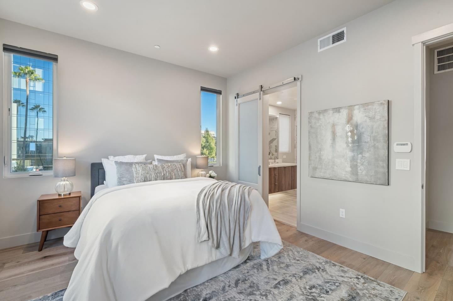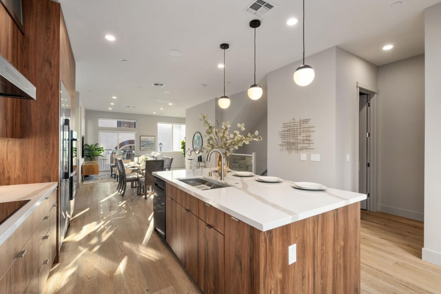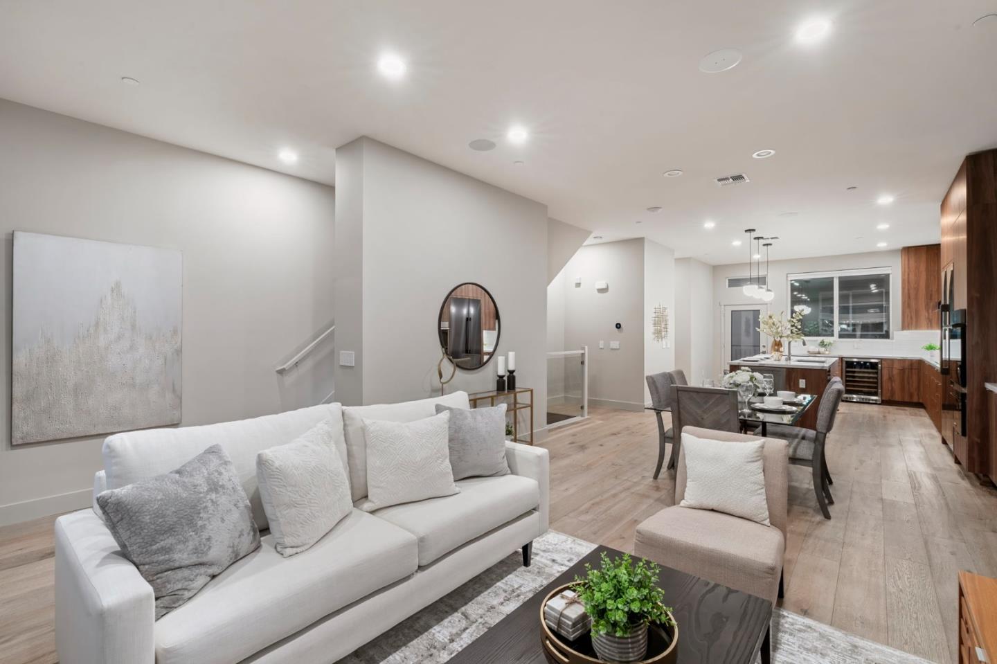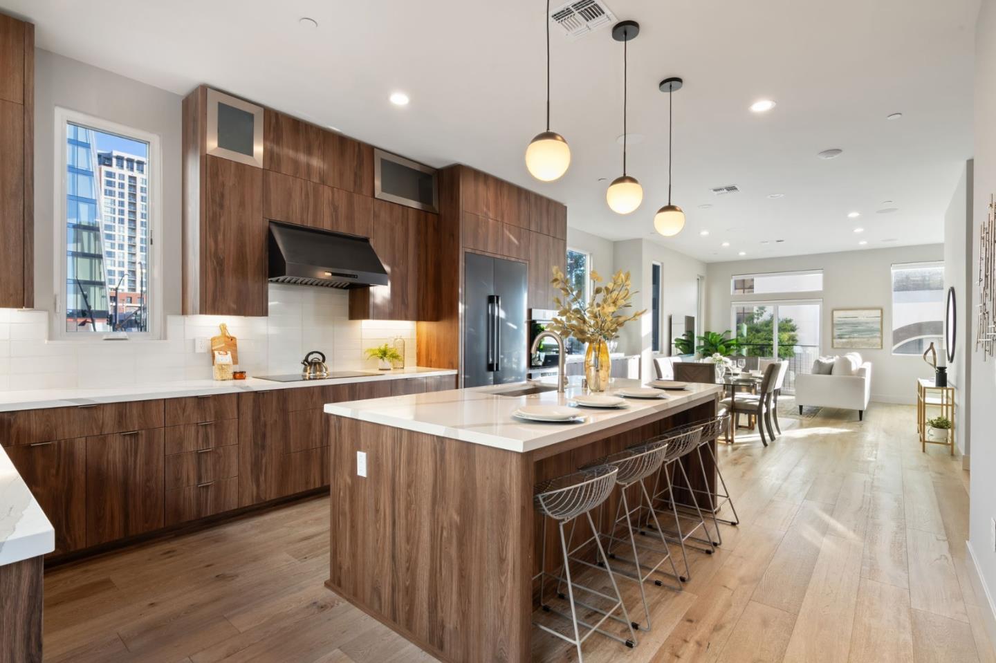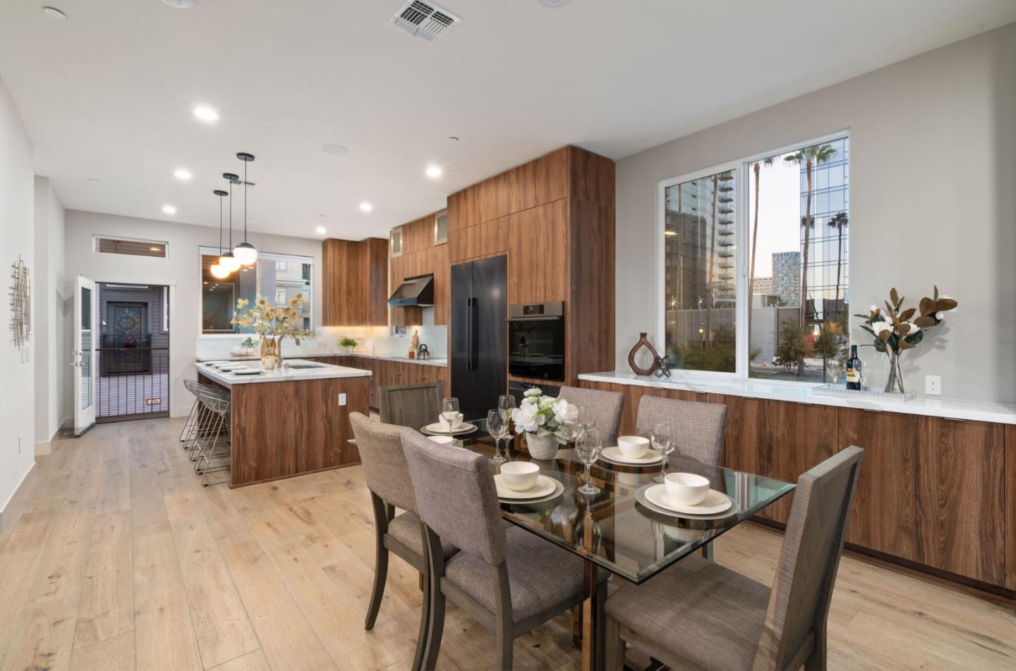 Ultra sophisticated end-unit townhome situated moments from exciting San Pedro Square Market- you'll be grabbing coffee, dinner, or drinks- among the incredible benefits of Downtown San Jose living. Numerous parks, shopping, theatre, and entertainment right out your doorstep. This custom upgraded 4 year new home is truly one-of-a-kind, with top-to-bottom upgrades including whole-home Lutron lighting and shade systems, zoned HVAC system, integrated sound system, and luxurious finishes and detail through out. All three bedrooms are en-suites with luxurious baths. First level has a full bedroom with built-in Murphy bed. The perfect versatile space for you, guests, or home office. Attached two-car garage provides ultimate convenience and security. Next, on the second level is the fabulous open-concept living and entertaining space, flooded with light on 3 sides. Stunning finishes with contemporary cabinetry, a massive kitchen island, wine refrigerator, and top-of-the-line Dacor appliances leaving your senses ablaze with all the incredible touches. Large walk-in pantry, half bath, built-in dining buffet and living space. Upper level features side-by-side washer/dryer, Primary suite with walk-in closet, and 3rd ensuite. Located at the nexus of commuting corridors.