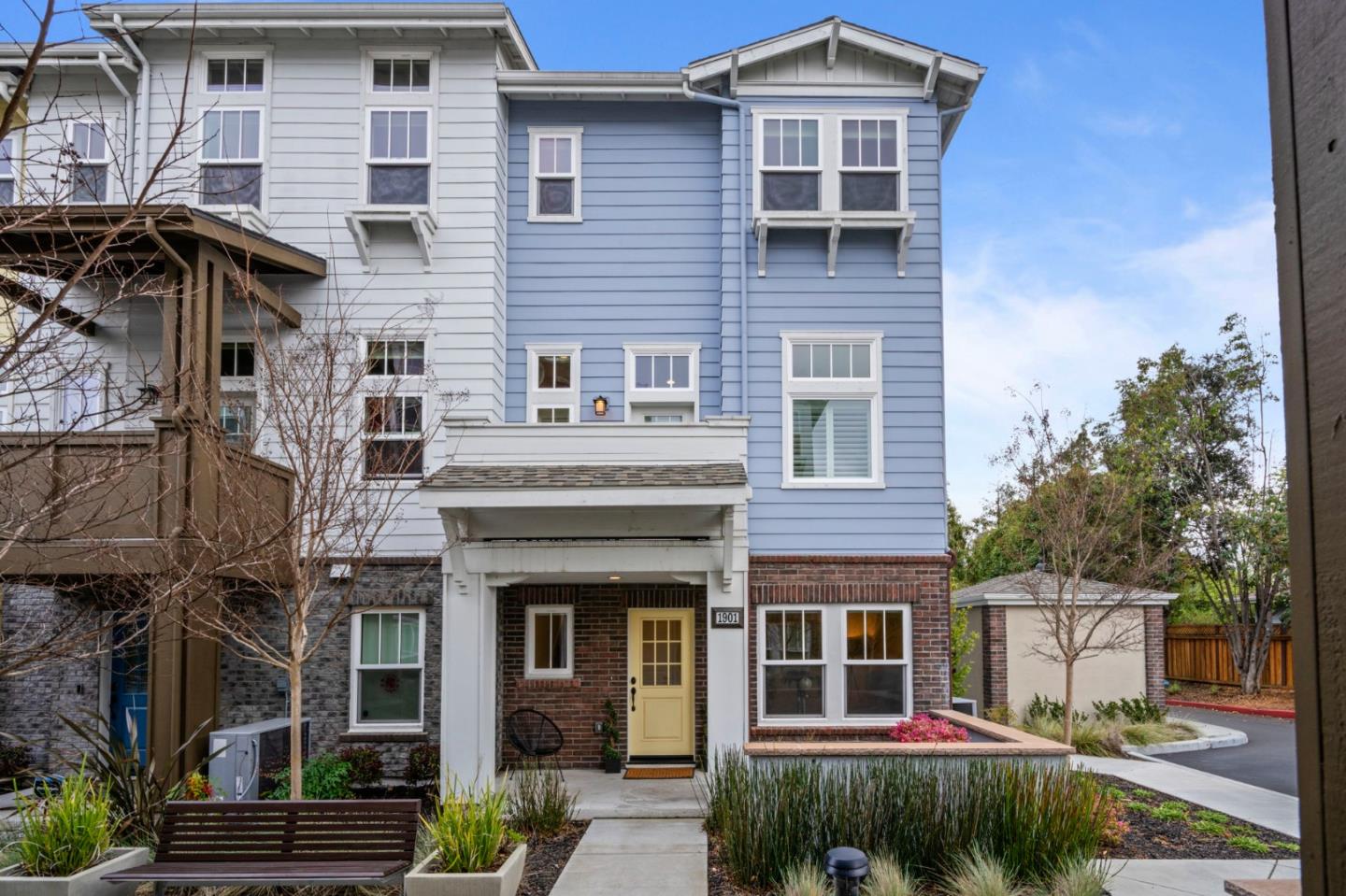 A rare combination, sitting privately at the rear of the complex & enjoying sun exposure on three sides, this bright end-unit home is situated in a sought after Mountain View location, just off the Permanente Creek trail. Moments from major tech centers, parks, shopping, dining and nearby exciting Downtown Mountain View. Enjoy pulling into your two-car attached garage. Lower level features a space perfect for an office/ flex space. Main level drenched in sunlight, trimmed in contemporary finishes. Kitchen with gas range plus a large island, sure to be the heart of the home. Another rare find- full laundry suite here on the main level with additional storage, plus a half bath. The bright great-room has high-end plantation shutters and rich wood floors, plus your own private terrace overlooking community green space. Conveniently situated on the upper level, are all three bright bedrooms, including a primary suite with walk-in closet and attached bath with a large vanity and dual sinks. Two additional spacious bedrooms access another full hallway bath. With just one shared wall, you'll enjoy the extra privacy and sunlight this home offers! Comfort 365 days a year with dual zone HVAC system. Community amenities include serene sitting areas, BBQ, Firepit, and mature trees.