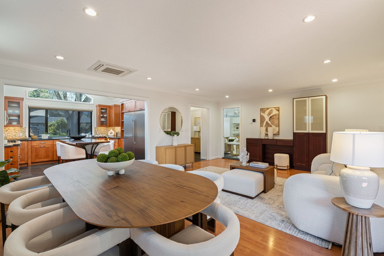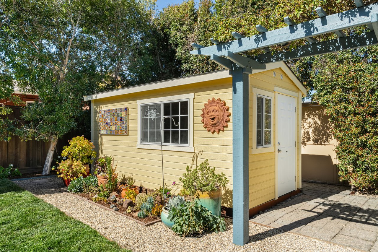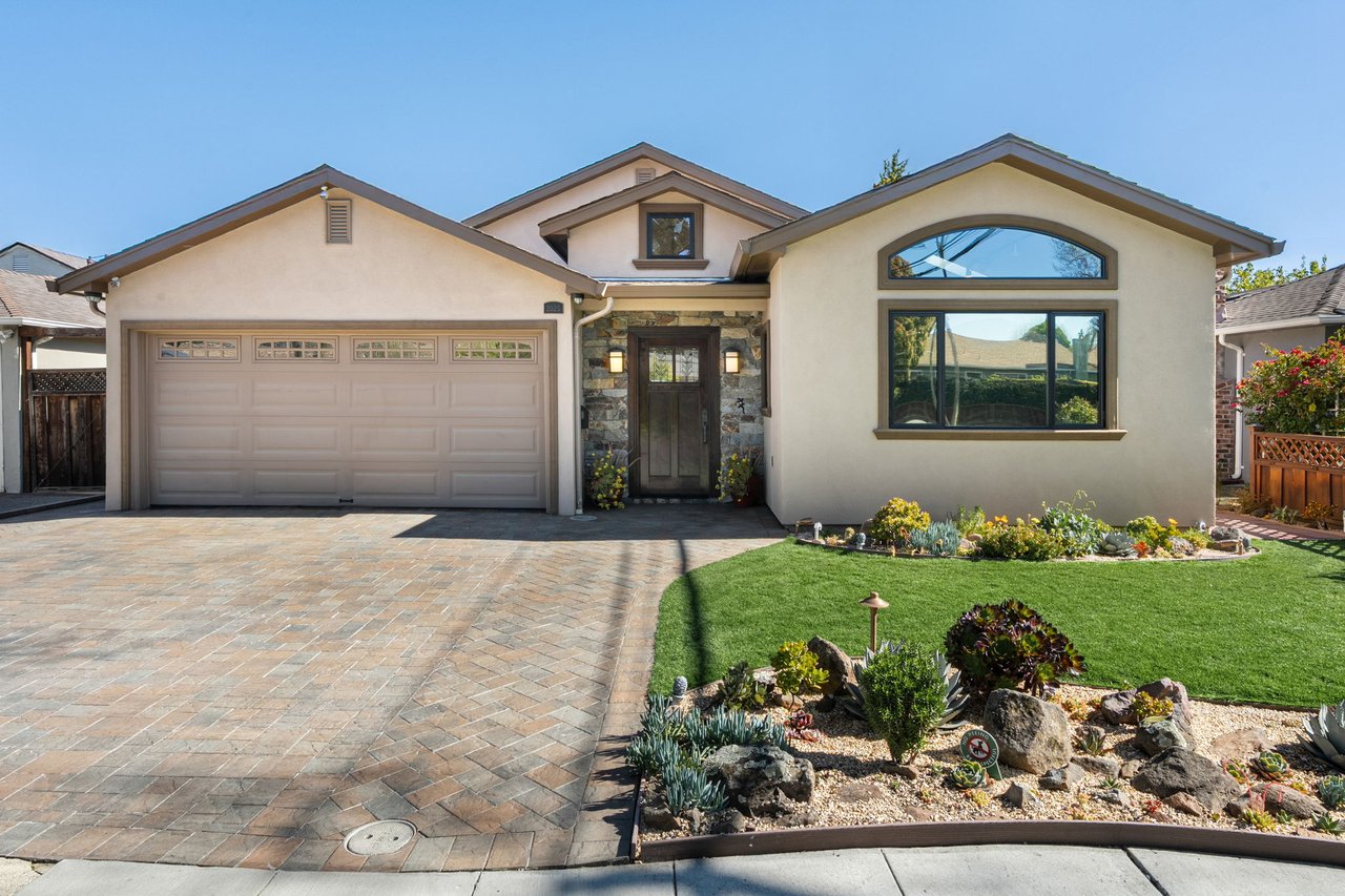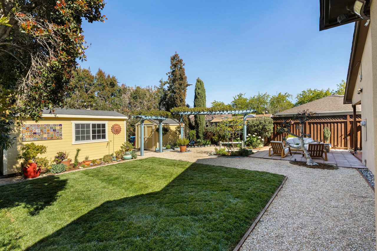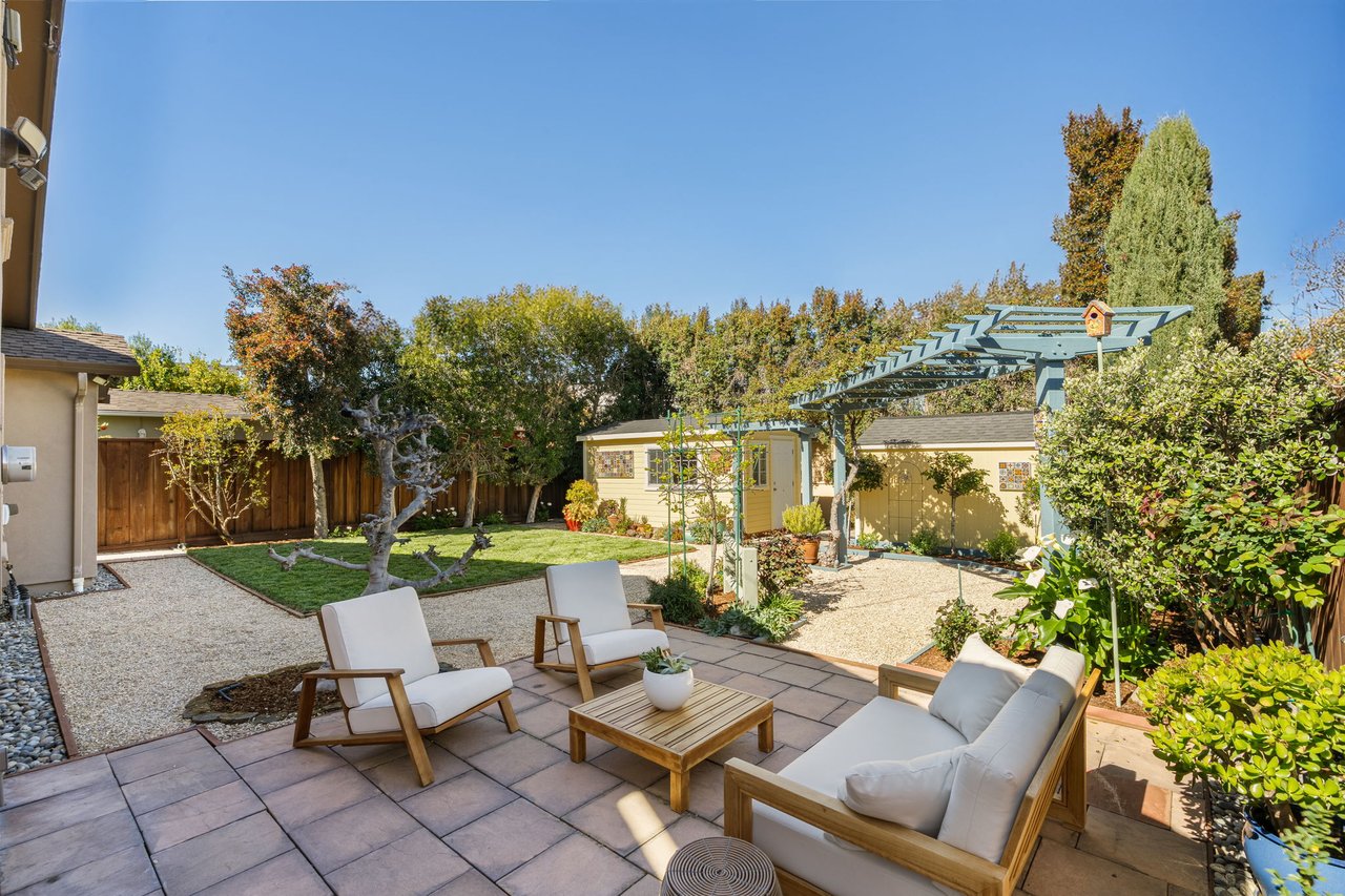A meticulously cared for and updated home with a high attention to detail throughout. Centrally located moments from Woodside Shopping Plaza and convenient commuting routes via Woodside Rd, Hwys 280, 101 and more. The formal entryway welcomes you to the open-concept floor plan with impressive, flexible spaces. The dramatic kitchen has soaring vaulted ceilings, is drenched in light from 3 sides plus a skylight- illuminating a custom eat-in island, ample storage with rich cabinetry, chef-quality oversized fridge and freezer, plus gas range. The finished garage space with built-in storage and epoxy-style flooring make for a flexible space, plus dedicated laundry room with sink. Four spacious bedrooms including a primary with dual closets and ensuite bath. The hall bath has dual vanities, vaulted ceiling and skylight for additional natural light. Outside, enjoy the large covered paver patio, mature landscaping with a lush lawn, mature flowers and fruit trees. Two large storage sheds for storage/workshop, plus integrated outdoor drainage system, A secure gate opens for convenient shopping/maintenance access. Easily accessible, walkable, and temperature regulated attic space is a storage dream. Central heating, cooling, upgraded insulation, and numerous additional features!
