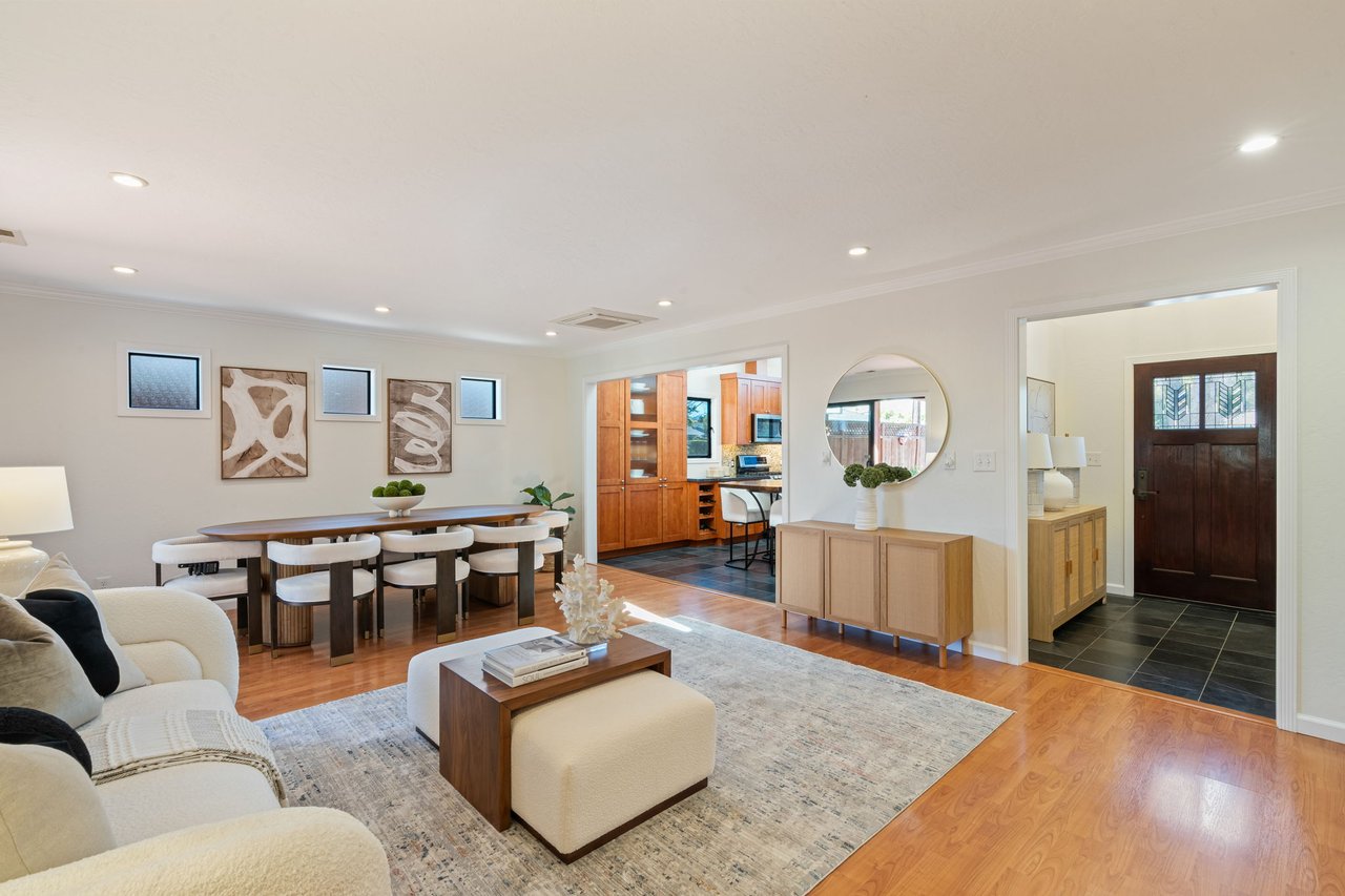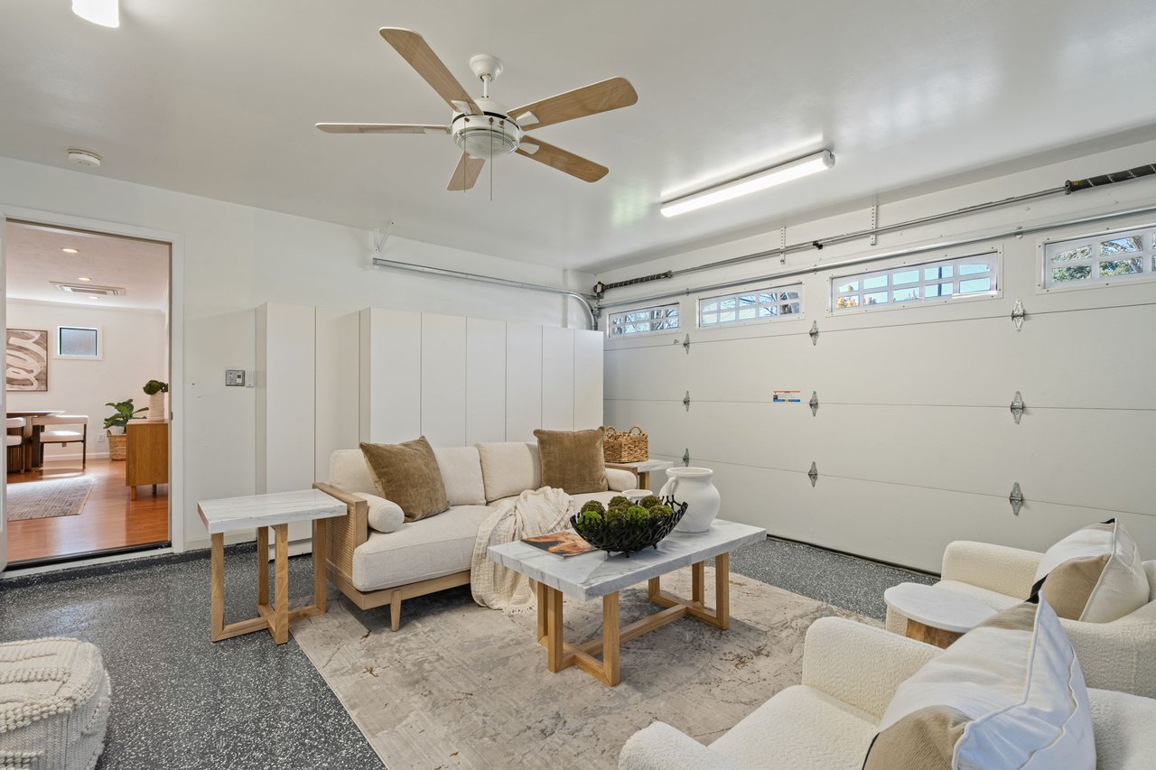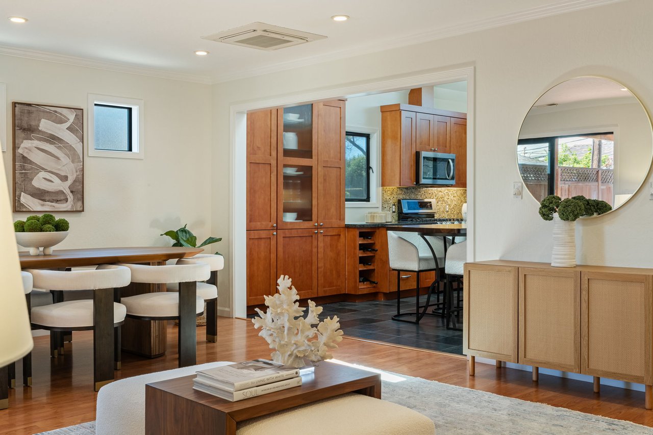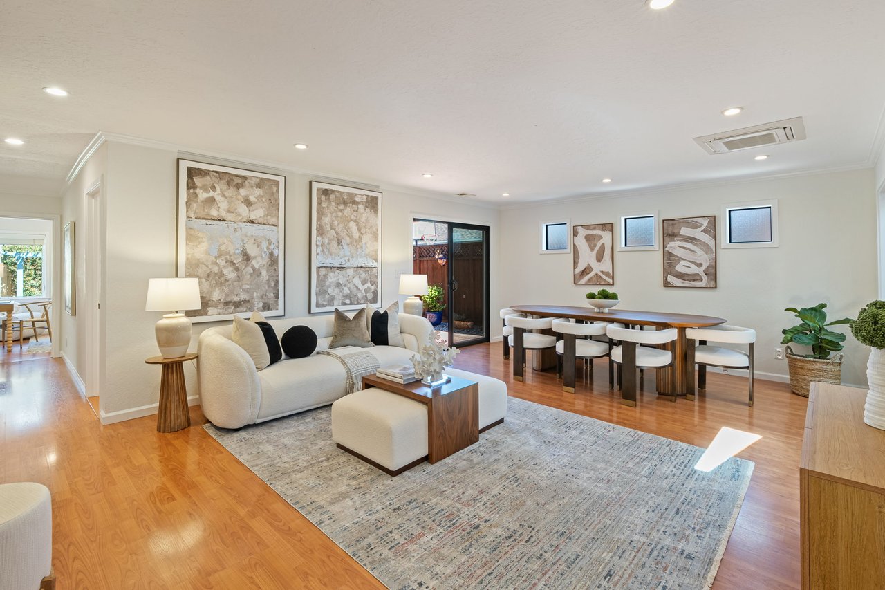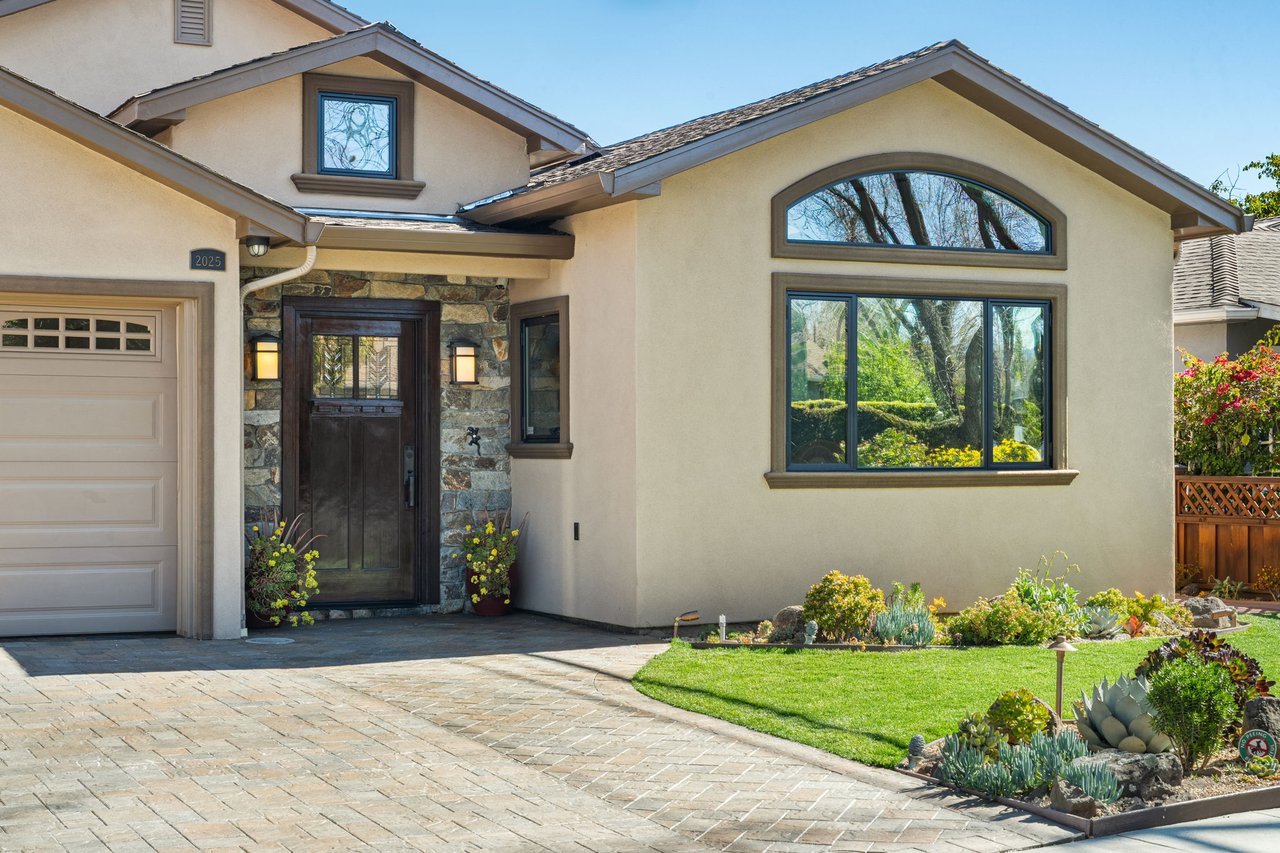 A meticulously cared for and updated home with a high attention to detail throughout. Centrally located moments from Woodside Shopping Plaza and convenient commuting routes via Woodside Rd, Hwys 280, 101 and more. The formal entryway welcomes you to the open-concept floor plan with impressive, flexible spaces. The dramatic kitchen has soaring vaulted ceilings, is drenched in light from 3 sides plus a skylight- illuminating a custom eat-in island, ample storage with rich cabinetry, chef-quality oversized fridge and freezer, plus gas range. The finished garage space with built-in storage and epoxy-style flooring make for a flexible space, plus dedicated laundry room with sink. Four spacious bedrooms including a primary with dual closets and ensuite bath. The hall bath has dual vanities, vaulted ceiling and skylight for additional natural light. Outside, enjoy the large covered paver patio, mature landscaping with a lush lawn, mature flowers and fruit trees. Two large storage sheds for storage/workshop, plus integrated outdoor drainage system, A secure gate opens for convenient shopping/maintenance access. Easily accessible, walkable, and temperature regulated attic space is a storage dream. Central heating, cooling, upgraded insulation, and numerous additional features!