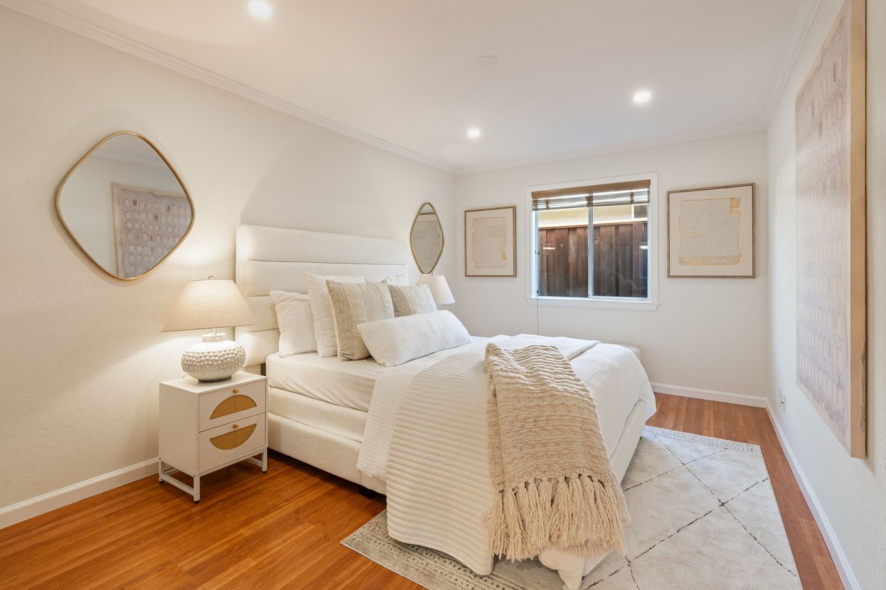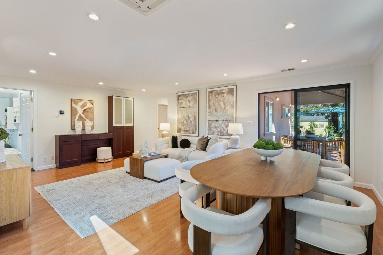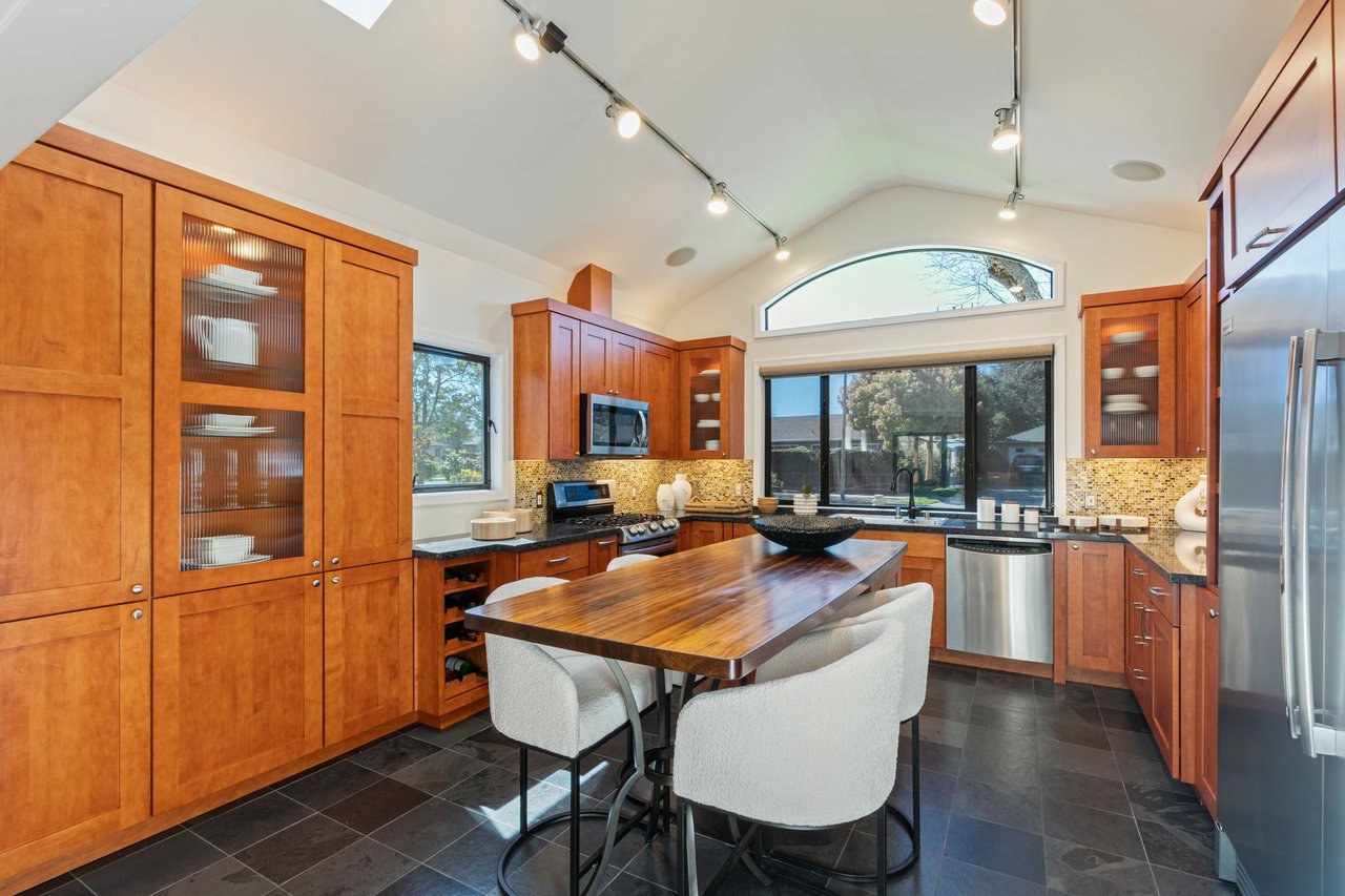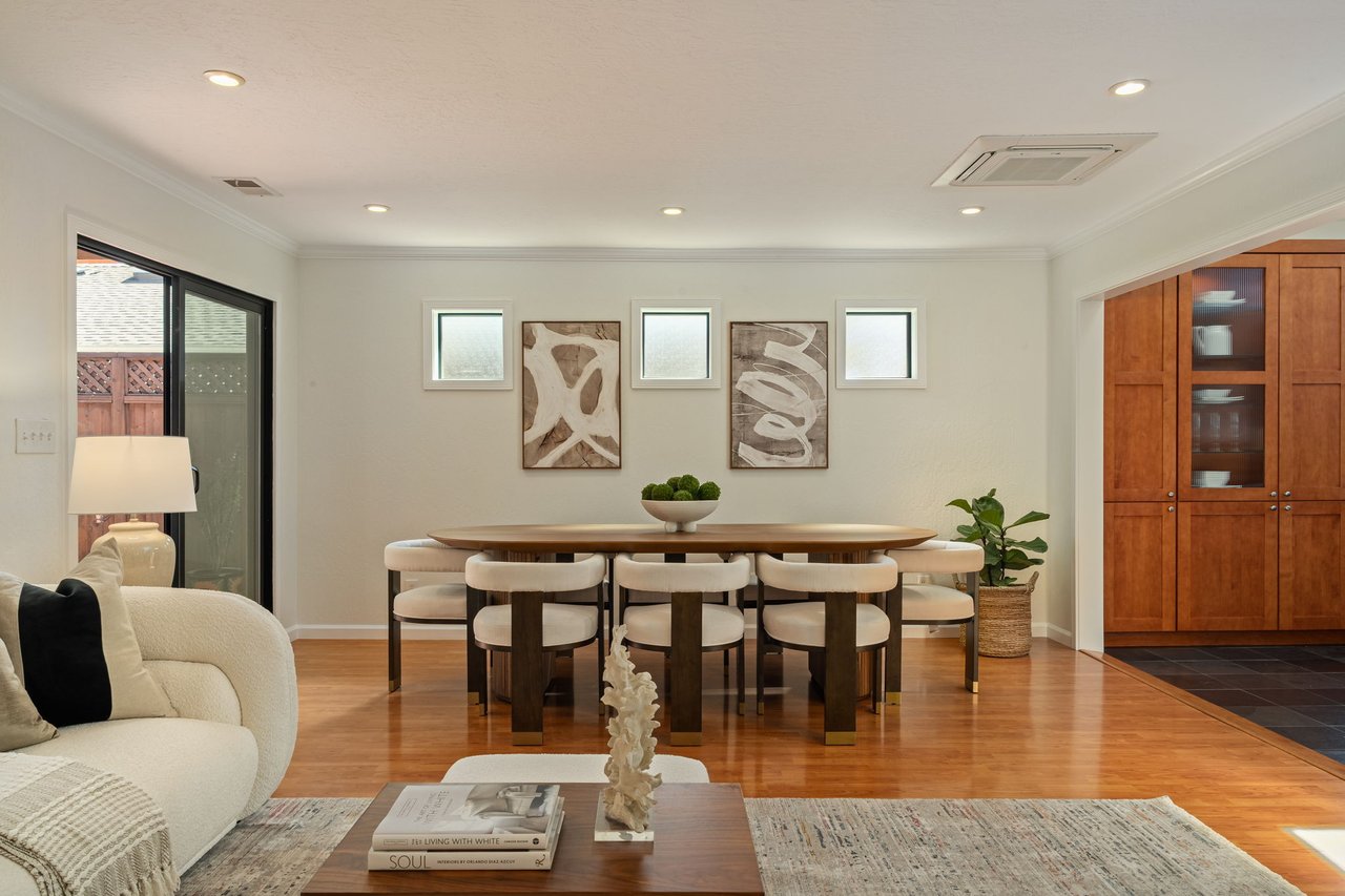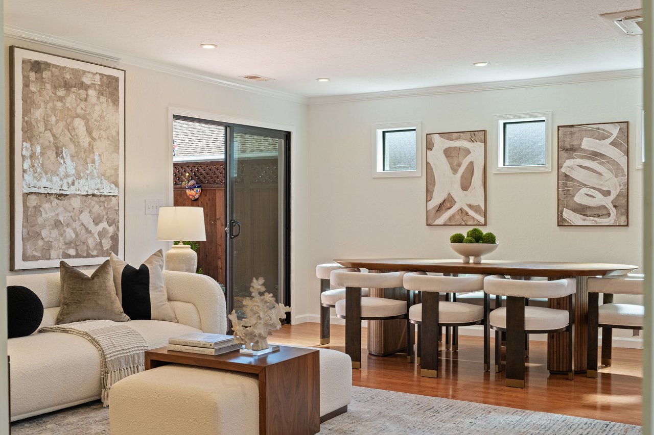 A meticulously cared for and updated home with a high attention to detail throughout. Centrally located moments from Woodside Shopping Plaza and convenient commuting routes via Woodside Rd, Hwys 280, 101 and more. The formal entryway welcomes you to the open-concept floor plan with impressive, flexible spaces. The dramatic kitchen has soaring vaulted ceilings, is drenched in light from 3 sides plus a skylight- illuminating a custom eat-in island, ample storage with rich cabinetry, chef-quality oversized fridge and freezer, plus gas range. The finished garage space with built-in storage and epoxy-style flooring make for a flexible space, plus dedicated laundry room with sink. Four spacious bedrooms including a primary with dual closets and ensuite bath. The hall bath has dual vanities, vaulted ceiling and skylight for additional natural light. Outside, enjoy the large covered paver patio, mature landscaping with a lush lawn, mature flowers and fruit trees. Two large storage sheds for storage/workshop, plus integrated outdoor drainage system, A secure gate opens for convenient shopping/maintenance access. Easily accessible, walkable, and temperature regulated attic space is a storage dream. Central heating, cooling, upgraded insulation, and numerous additional features!