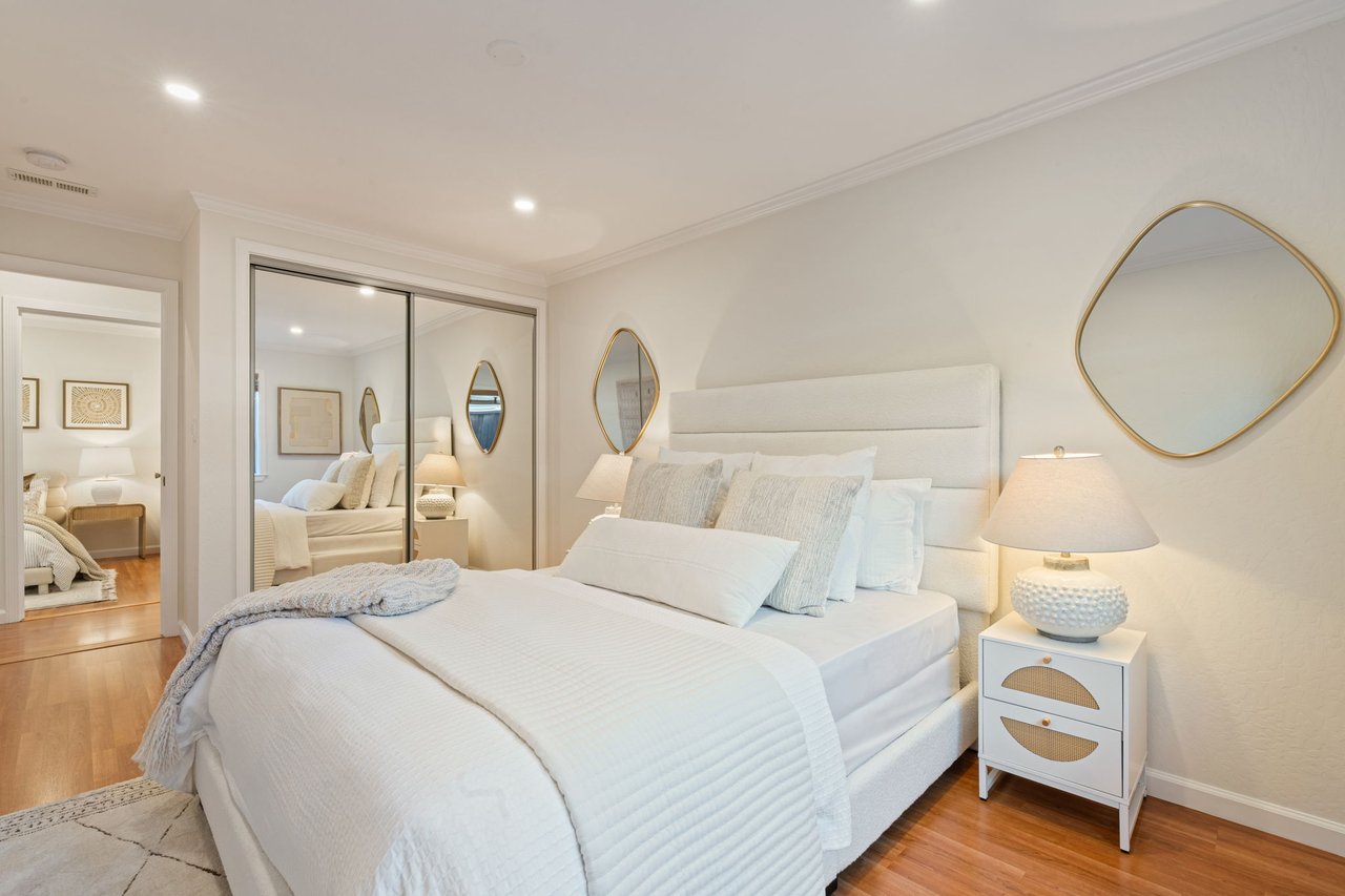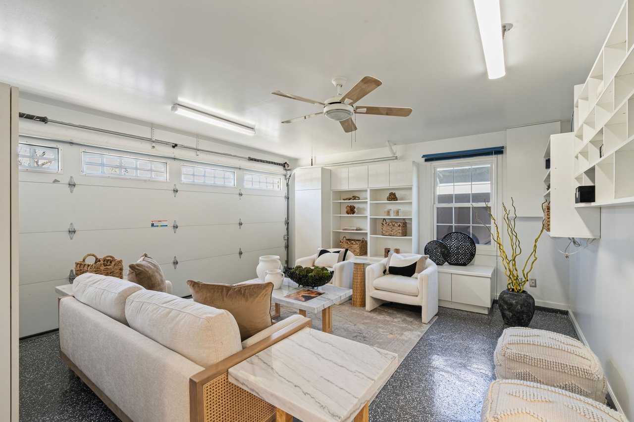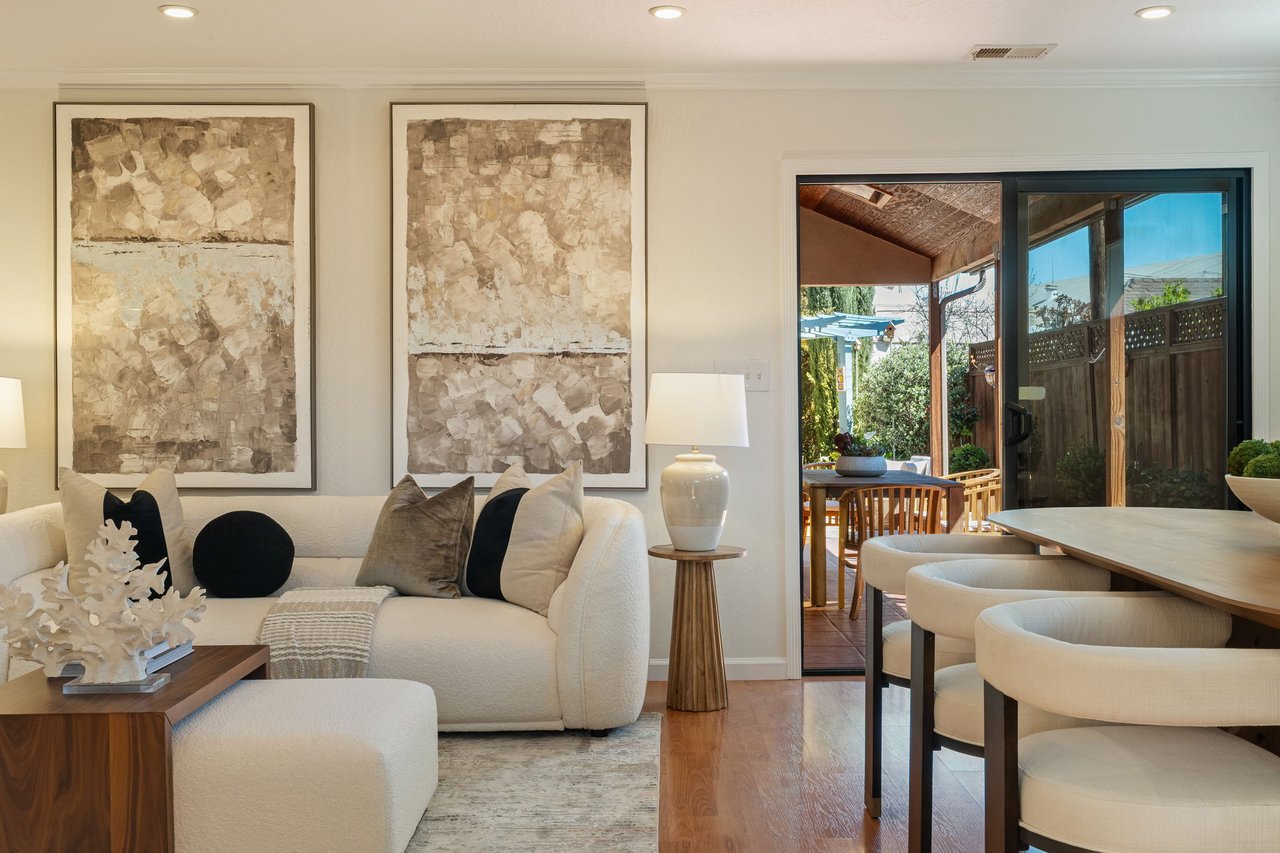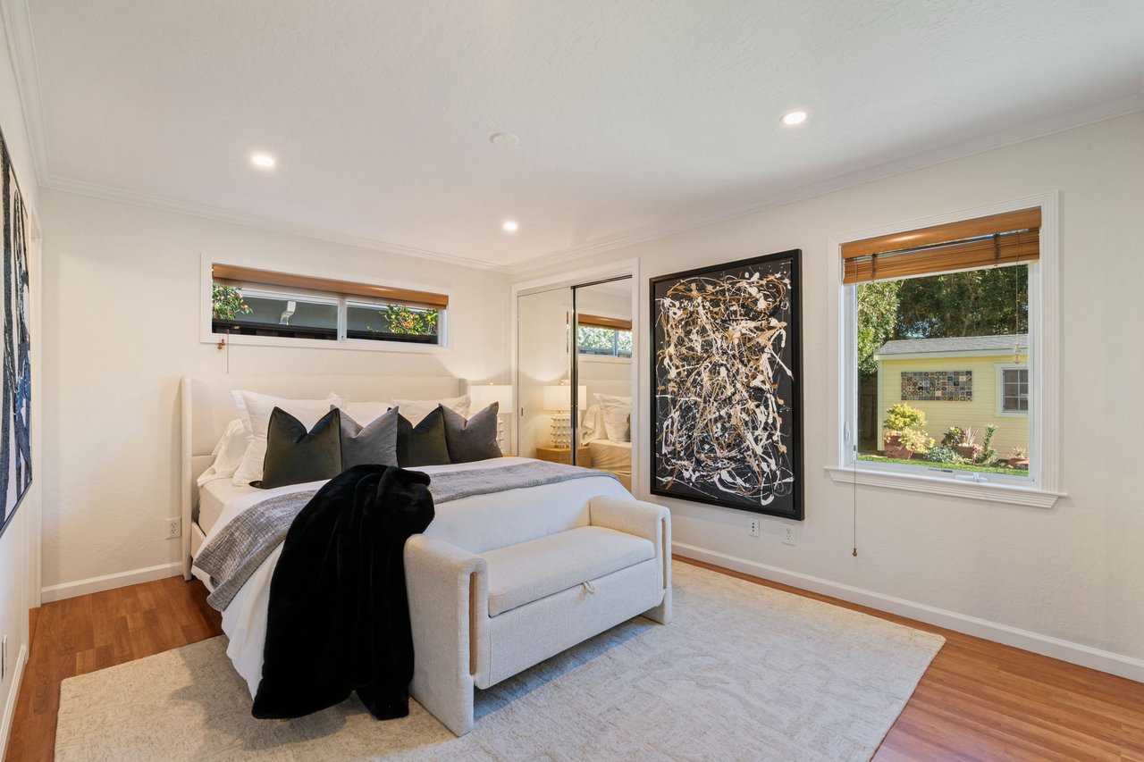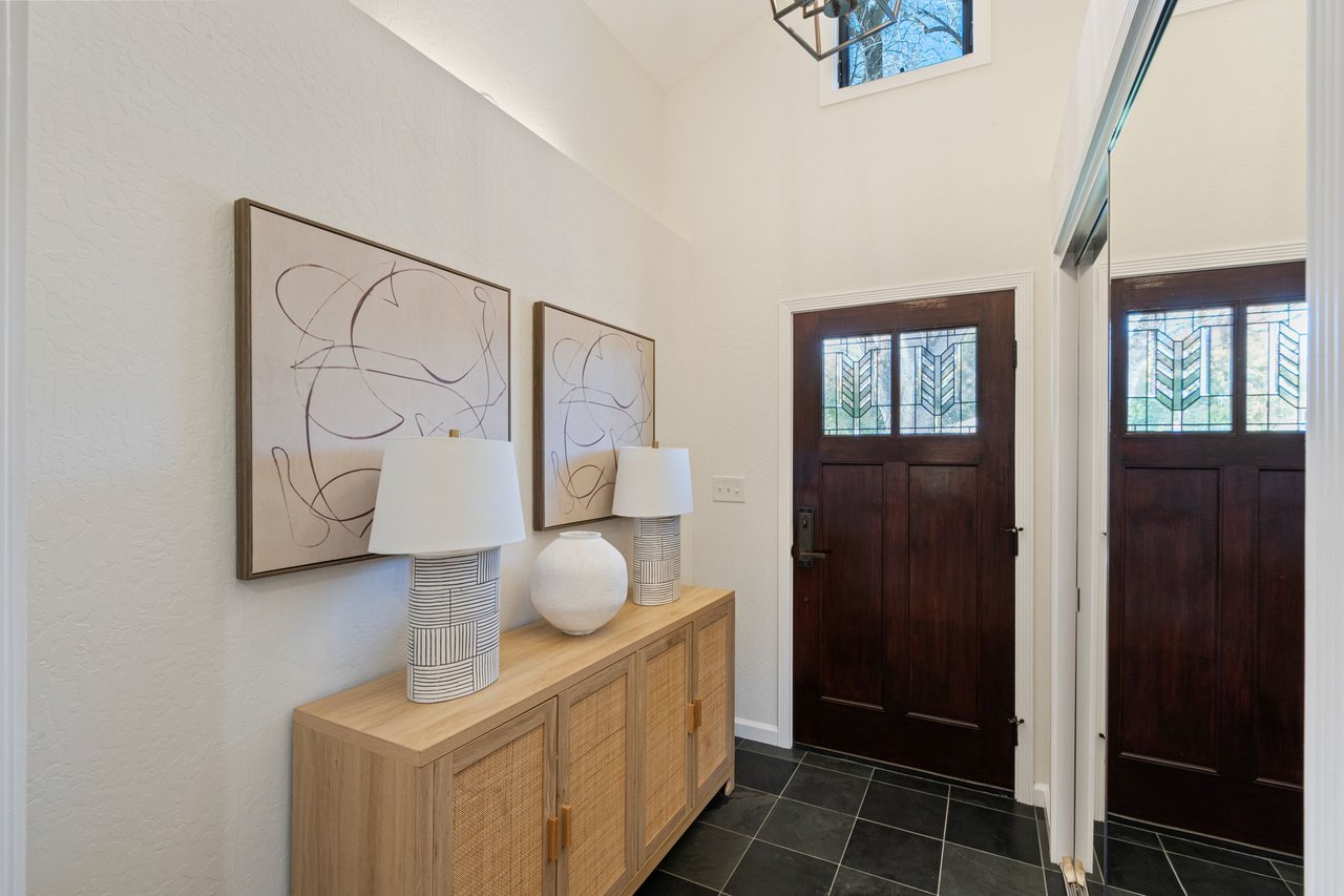 A meticulously cared for and updated home with a high attention to detail throughout. Centrally located moments from Woodside Shopping Plaza and convenient commuting routes via Woodside Rd, Hwys 280, 101 and more. The formal entryway welcomes you to the open-concept floor plan with impressive, flexible spaces. The dramatic kitchen has soaring vaulted ceilings, is drenched in light from 3 sides plus a skylight- illuminating a custom eat-in island, ample storage with rich cabinetry, chef-quality oversized fridge and freezer, plus gas range. The finished garage space with built-in storage and epoxy-style flooring make for a flexible space, plus dedicated laundry room with sink. Four spacious bedrooms including a primary with dual closets and ensuite bath. The hall bath has dual vanities, vaulted ceiling and skylight for additional natural light. Outside, enjoy the large covered paver patio, mature landscaping with a lush lawn, mature flowers and fruit trees. Two large storage sheds for storage/workshop, plus integrated outdoor drainage system, A secure gate opens for convenient shopping/maintenance access. Easily accessible, walkable, and temperature regulated attic space is a storage dream. Central heating, cooling, upgraded insulation, and numerous additional features!