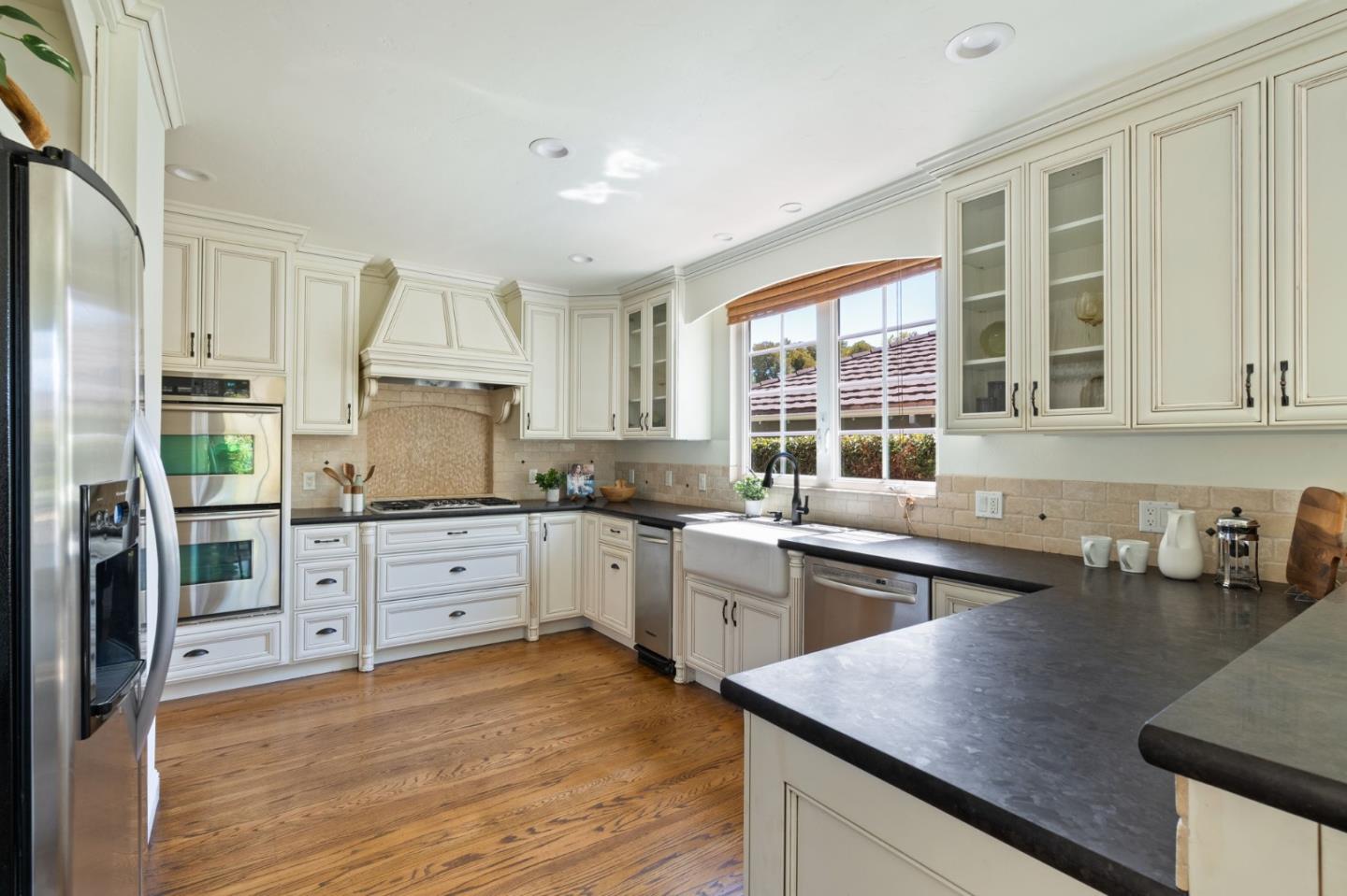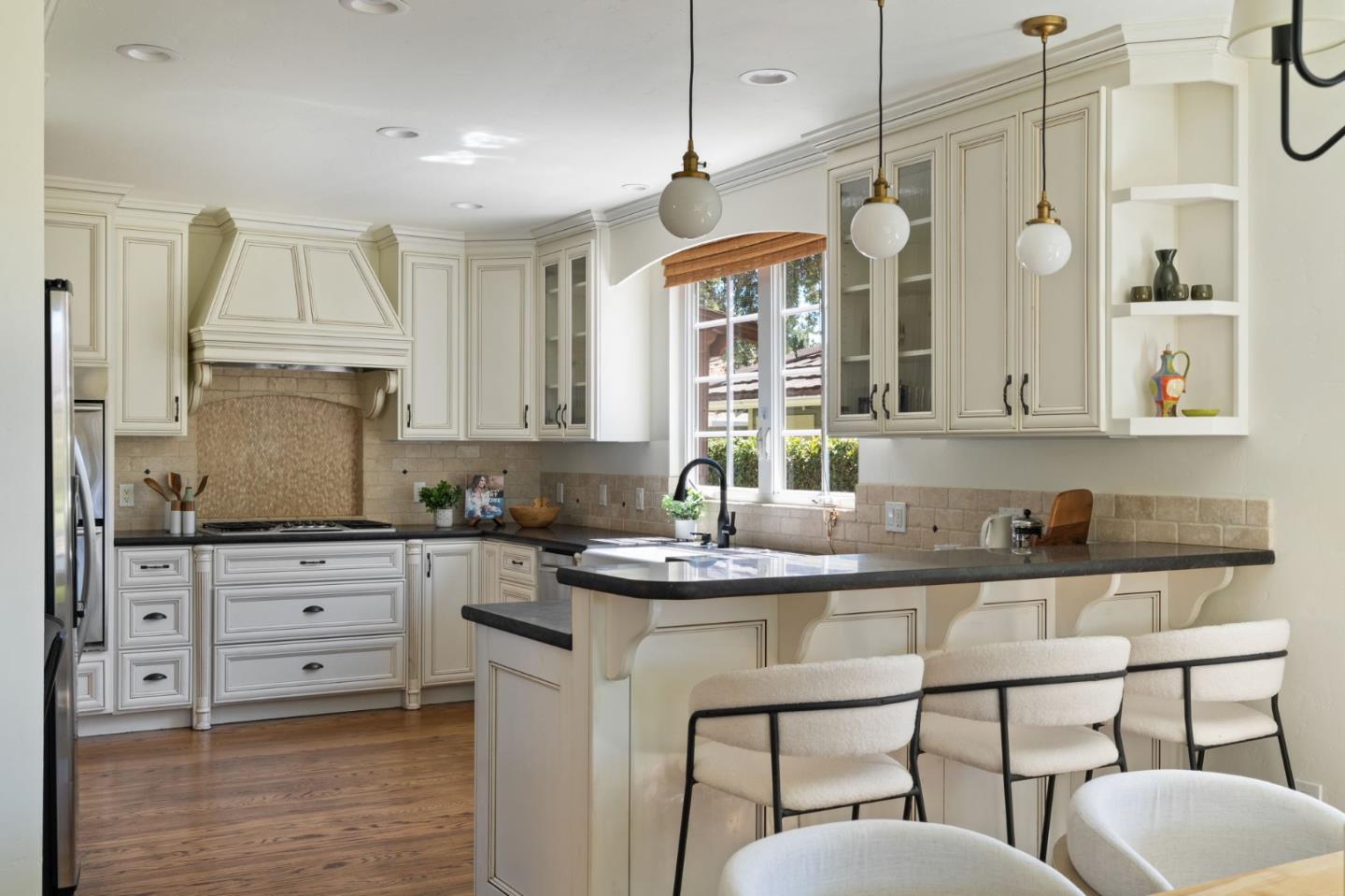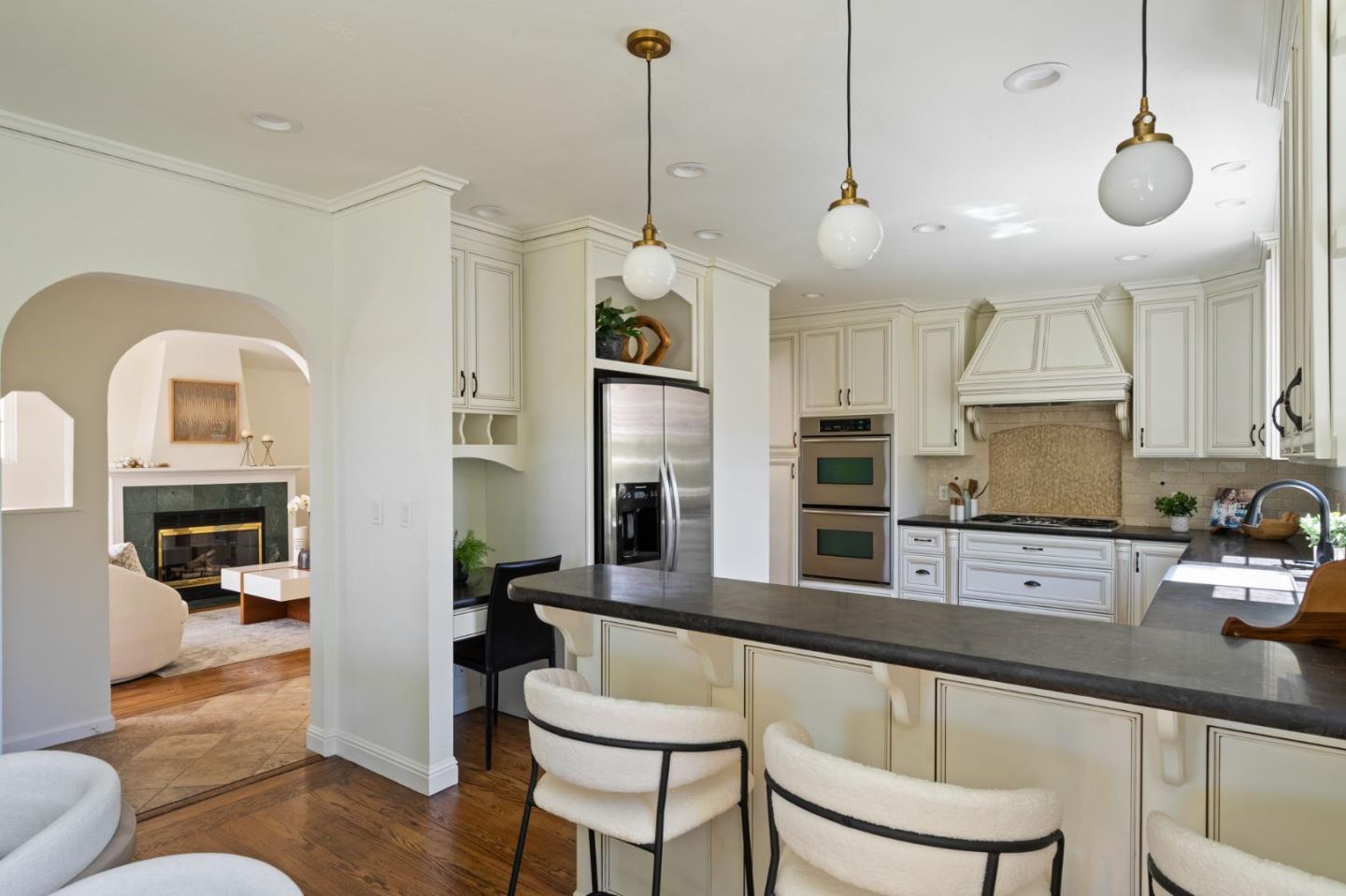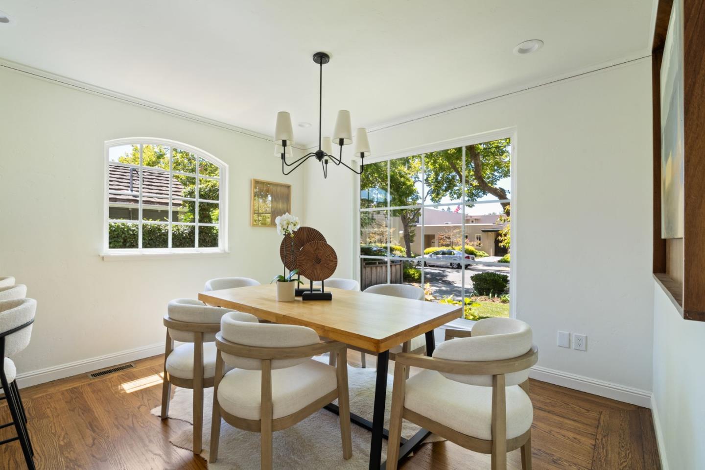 Thoughtfully reimagined Mt. Carmel home situated on a picturesque tree-lined street, on one of the most sought-after blocks in Redwood City. Rich hardwood floors welcome you inside, as light floods the spaces on all sides. The formal living area has coved ceilings, and elegant details, all situated around a cozy fireplace. The spacious chef's kitchen has a farmhouse sink, gas range, double ovens, and a great peninsula with seating area, and a bright dining space. The main level has 3 spacious bedrooms, two full baths each with custom details and a family room with tray ceiling and sliding glass doors that open to the large private backyard with grassy yard, large paved patio, storage shed, and detached garage- perfect for flex space or storage. Back inside, just off the side door is a great mud-room area with laundry closet. Upstairs is the full-floor primary suite with bright sun exposure, walk-in closets, bonus space, and an attached full bath. Enjoy this prominent location just moments from popular schools, parks, Whole Foods, exciting Downtown Redwood City, and convenient commuting locations.